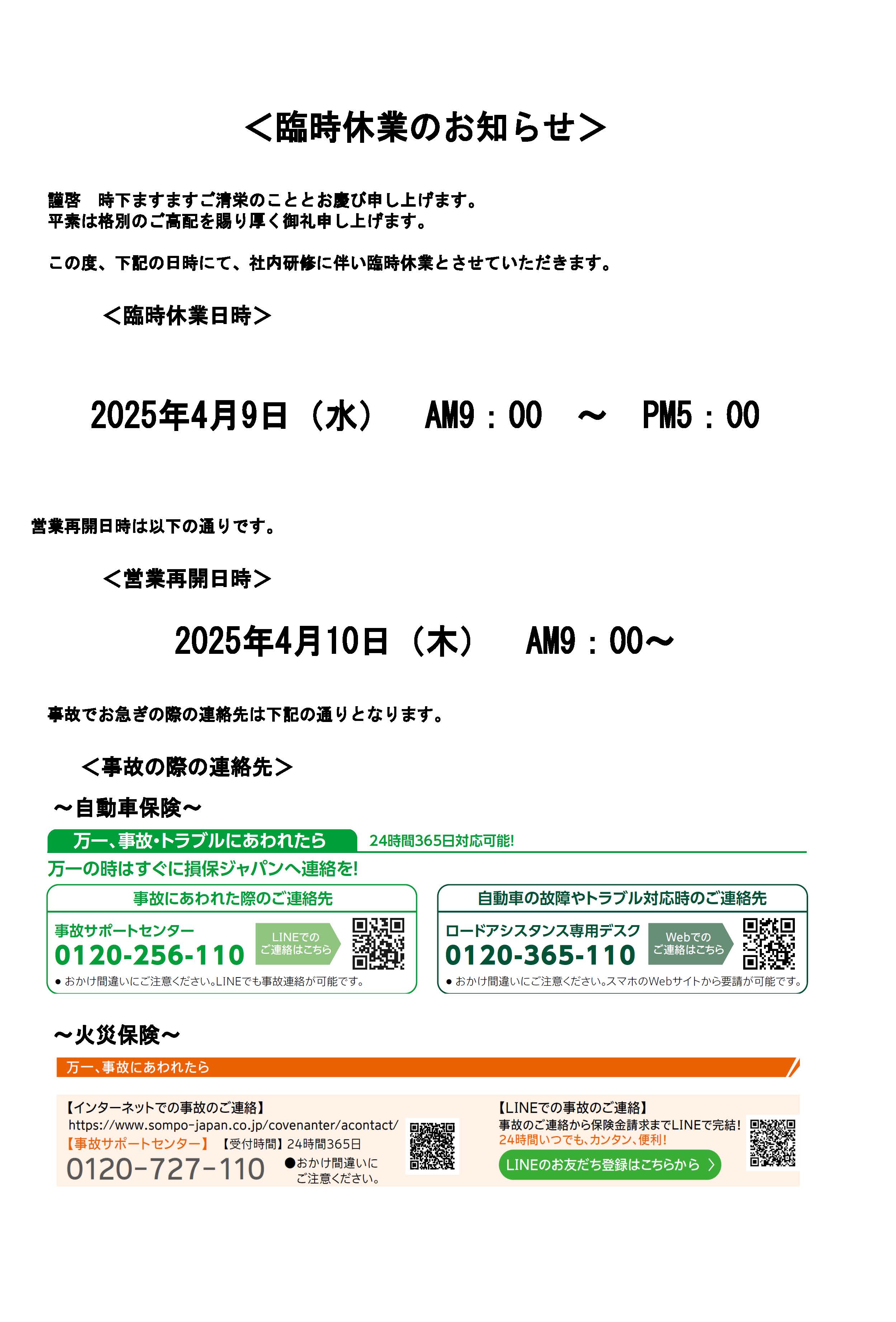 2025年04月07日臨時休業のお知らせいつもお世話になっております。大変恐縮ではございますが、社内研修に伴い、上記日程を臨時休業とさせていただきます。お手数をおかけいたしますが、よろしくお願い申し上げます。