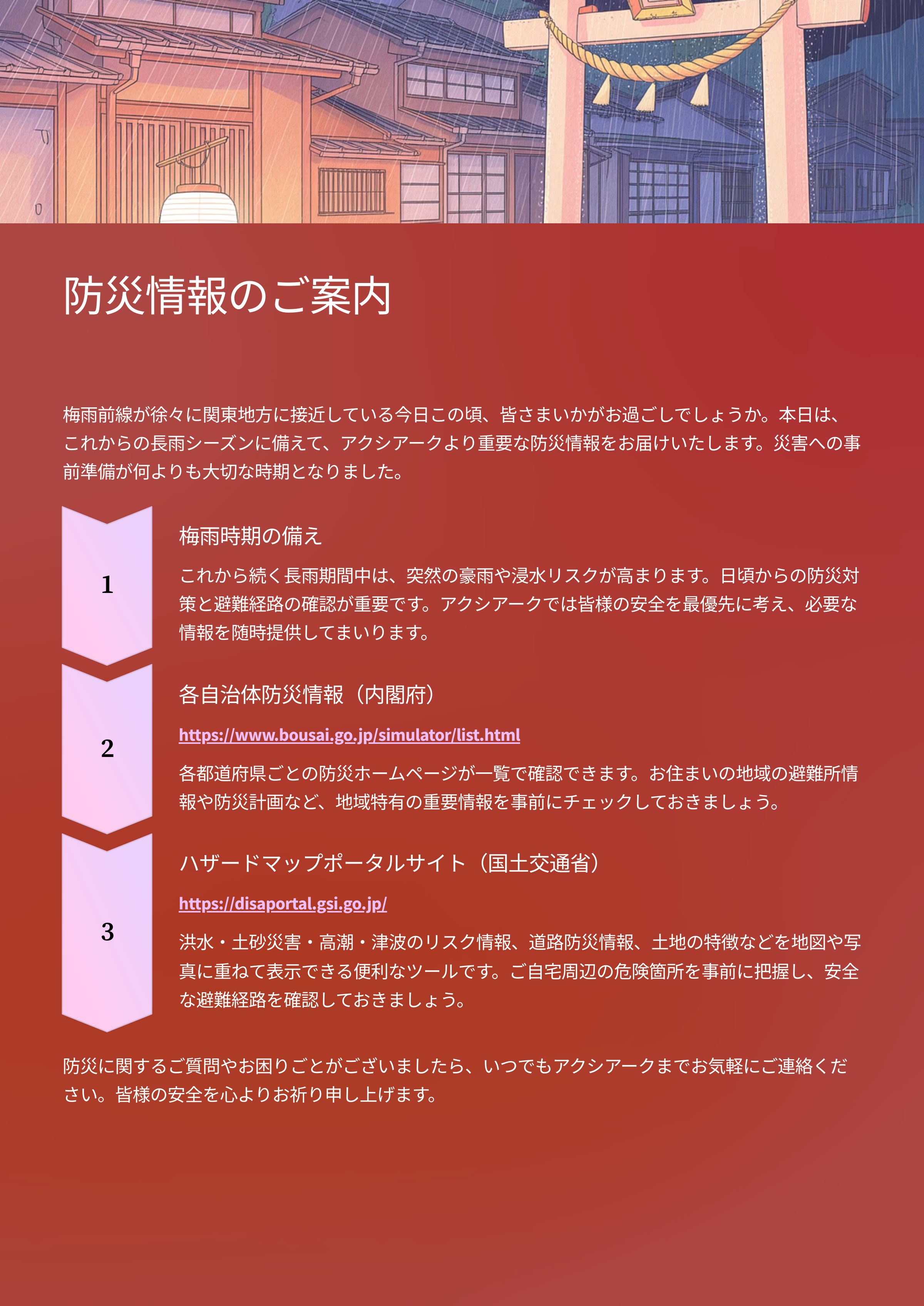 2025年10月30日2025年10月AXIARQよりの情報提供2025年10月のアクシアークからの情報提供です。今回は、火災保険に自動付帯されております「すまいとくらしのアシスタントダイヤル」のご紹介です。お困りの際には是非ご活用ください。