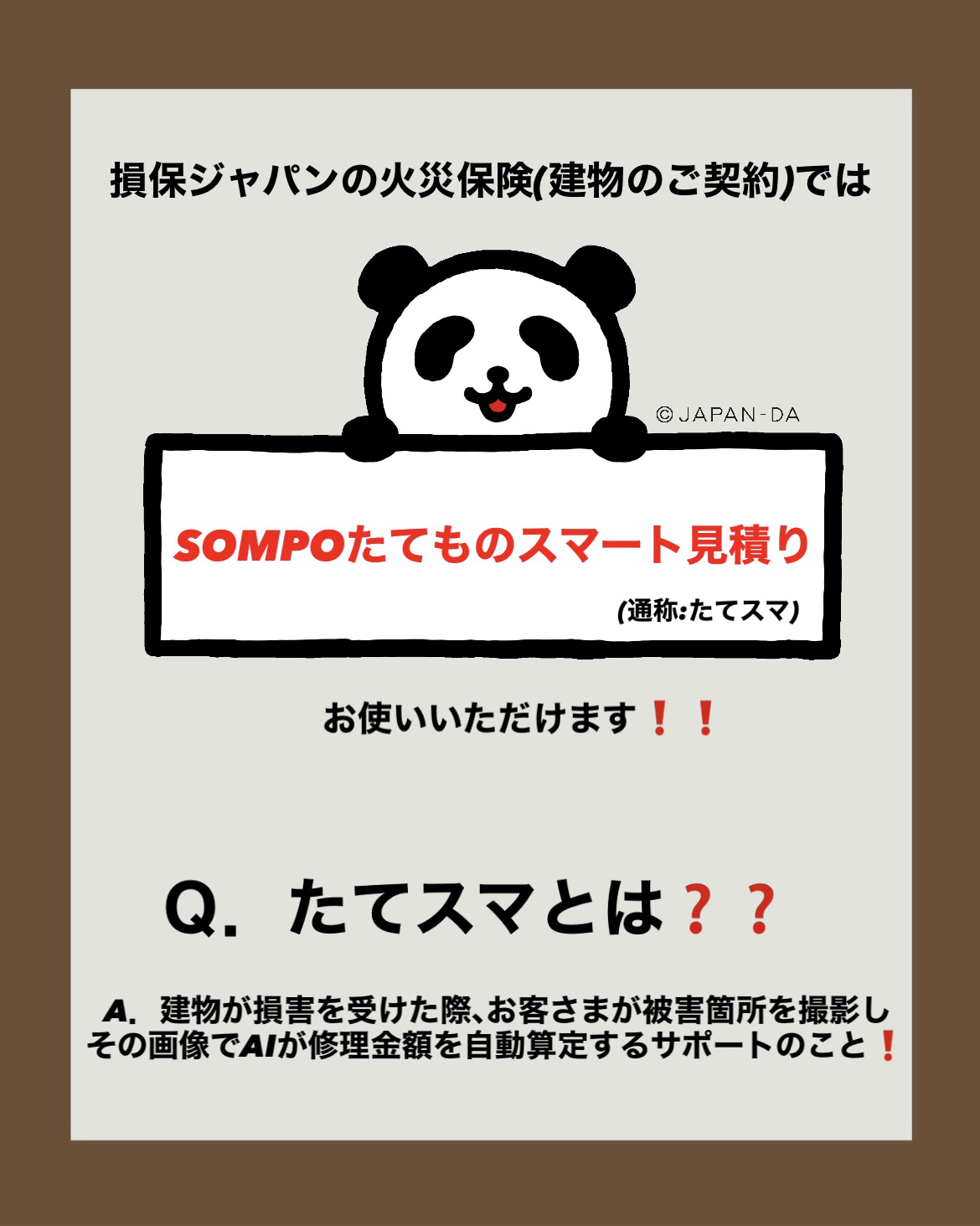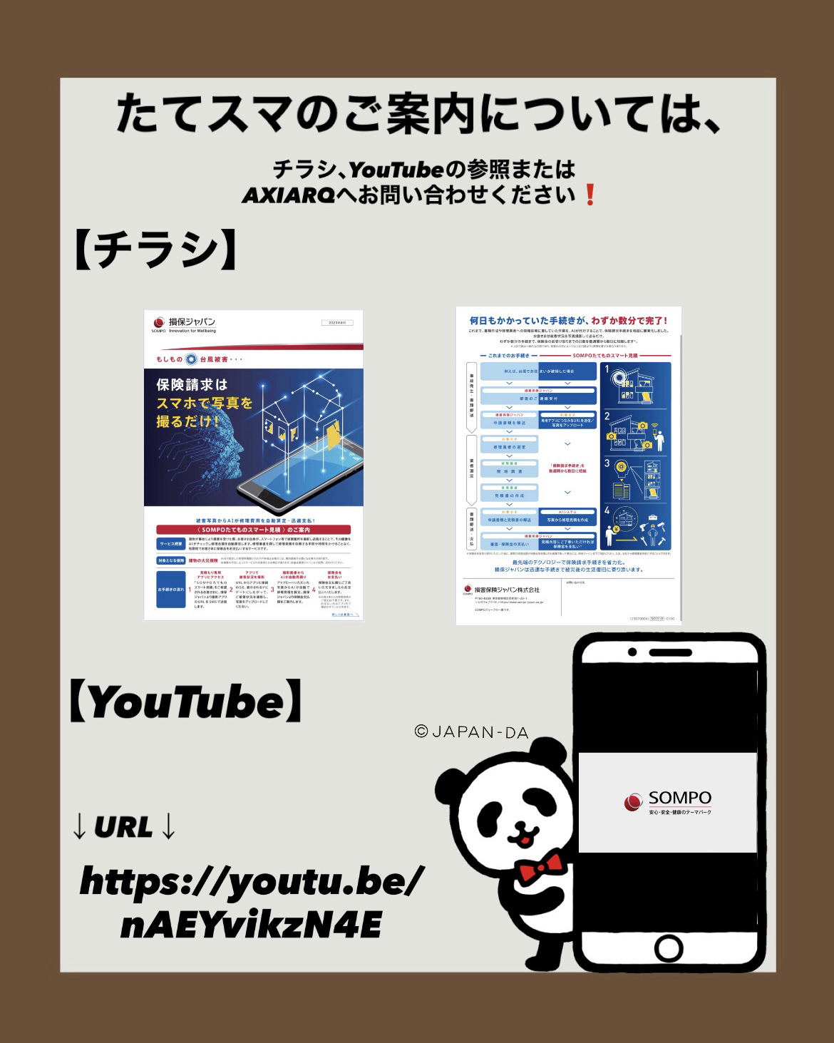 2025年07月31日2025年7月AXIARQよりの情報提供保険の請求って面倒なイメージありませんか?損保ジャパンの火災保険(建物)は、下記の4つの項目を満たしていれば、【たてものスマート見積もり】をご活用いただけ、請求書の提出不要でご請求が可能でございます!!◎以下の事故種別である!風雹雪災、物体飛来、盗難、不測かつ突発的な事故◎損害物が以下である!建物外装部分(屋根を除く)、門へい垣・カーポートなどの外構部分◎お客さまがスマートフォンをお持ちで、本サービスの利用を承諾いただける!◎支払保険金が100万円以下であることが見込まれる!チラシやYouTubeのご案内がございますので、ご参照ください!AXIARQへのお問い合わせもお待ちしております!【たてスマ:チラシ】https://www.sompo-japan.co.jp/-/media/SJNK/files/covenanter/acontact/other/tatemonosmart202308.pdf【たてスマ:YouTube】https://youtu.be/nAEYvikzN4E