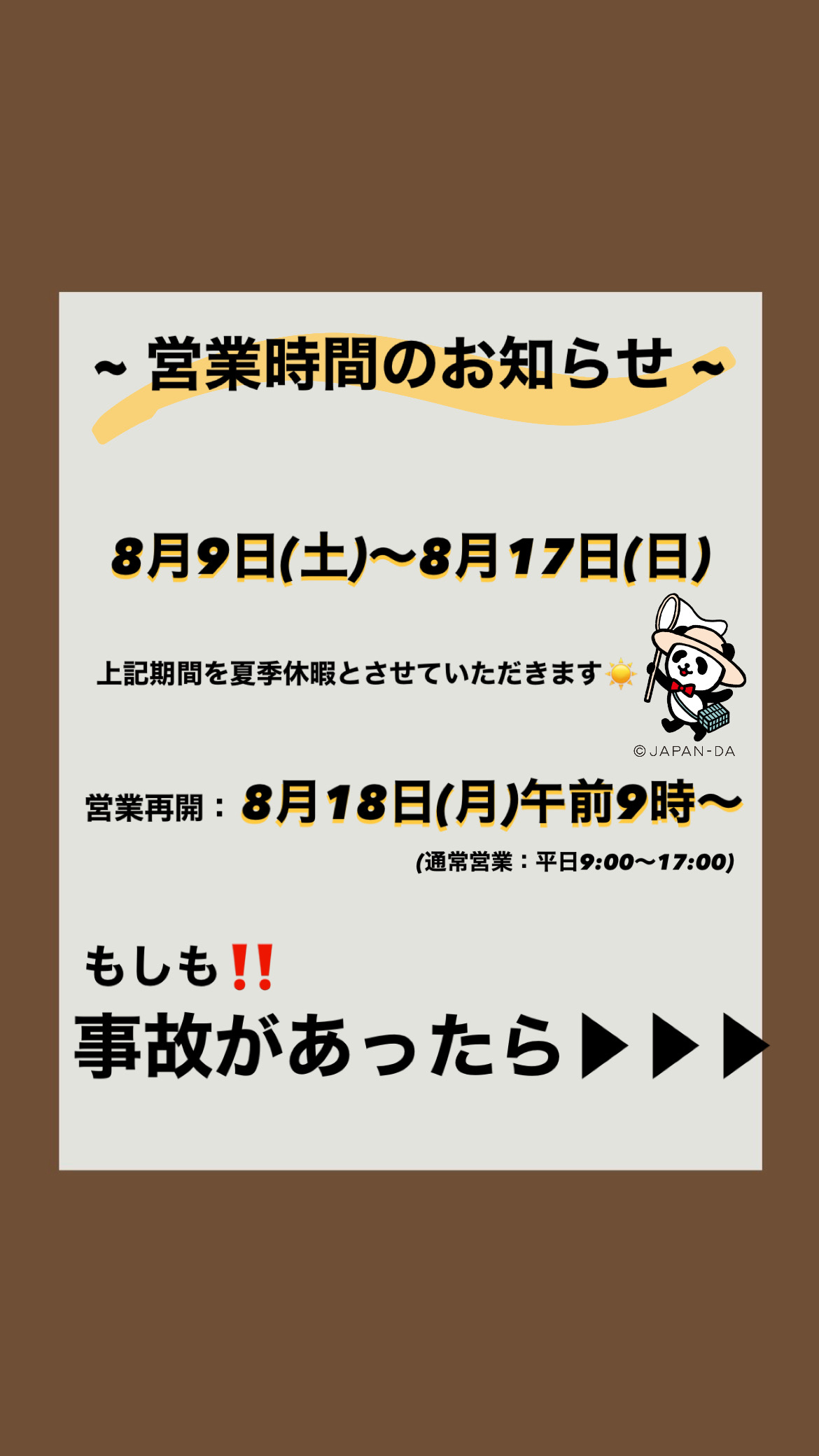 2025年08月05日夏季休業のお知らせいつもお世話になっております。暑い日が続いておりますがいかがお過ごしでしょうか?夏季休業日のお知らせをさせていただきます。酷暑が続いておりますので、熱中症、体調不良にはくれぐれもお気を付けいただきお過ごしください。よろしくお願い申し上げます。
