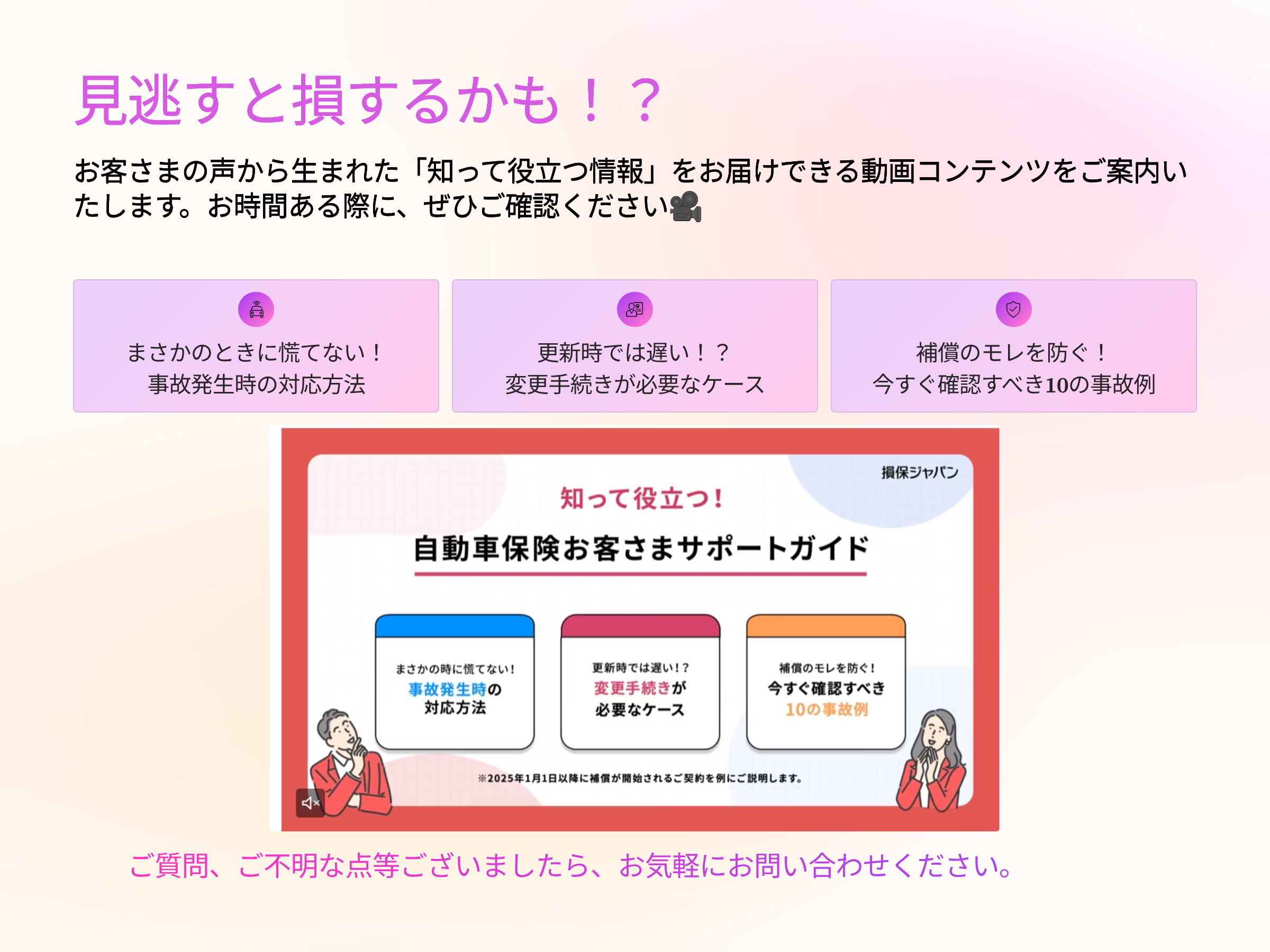 2025年11月27日2025年11月AXIARQよりの情報提供インスタグラム、モバソンチャットでも随時お役立ち情報を更新しております。モバソンチャットのご登録をご希望の方はお気軽にお問い合わせください。関連リンク:https://www.sompo-japan.co.jp/kinsurance/automobile/support/?ref=B6061+000&ref_sub=0000000001&a